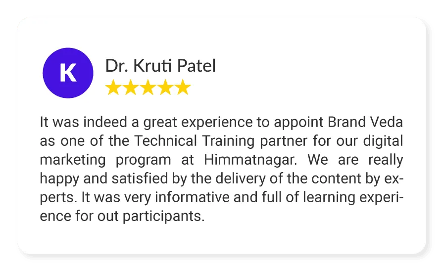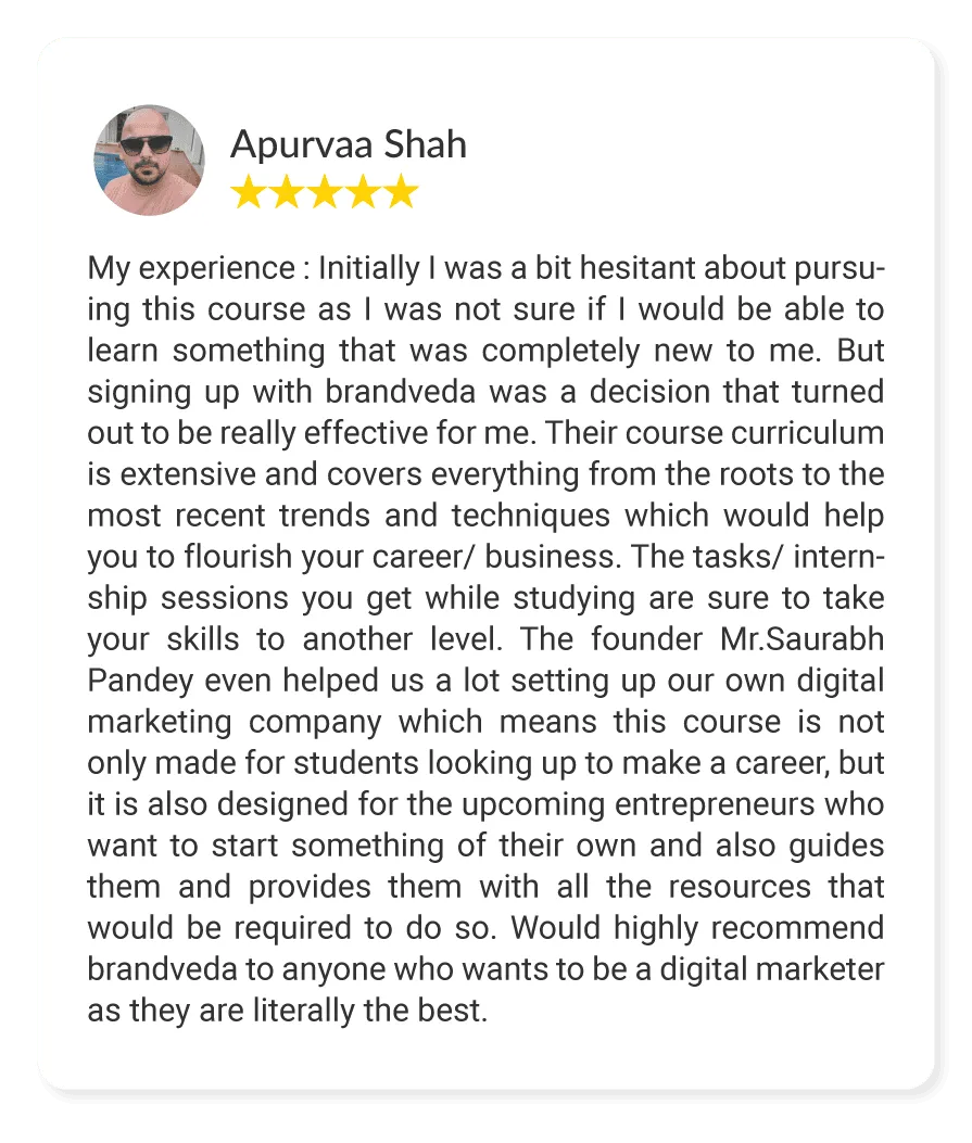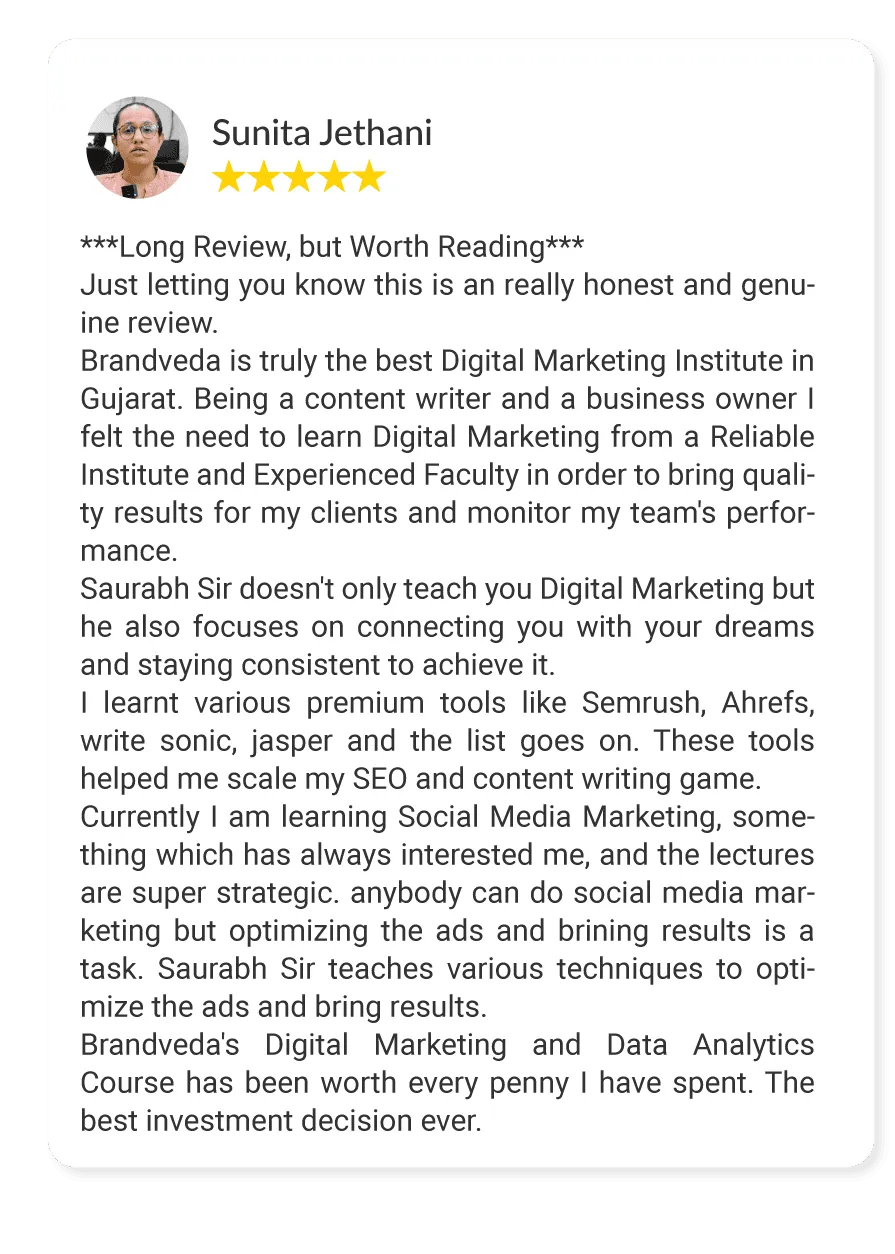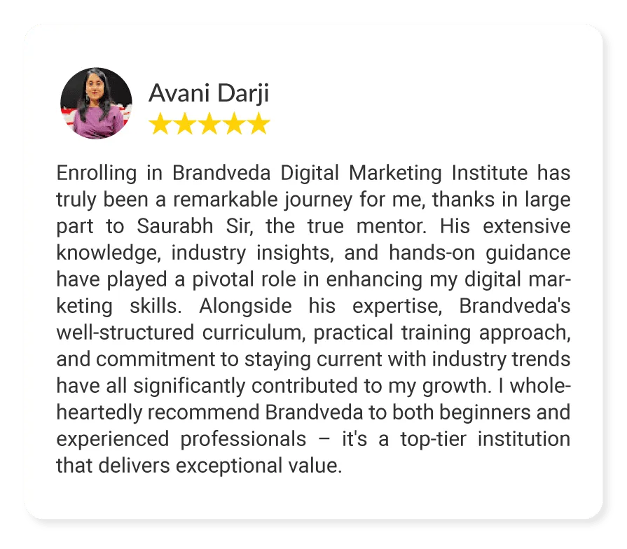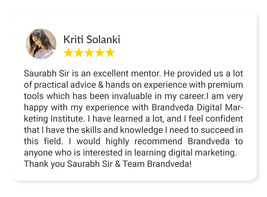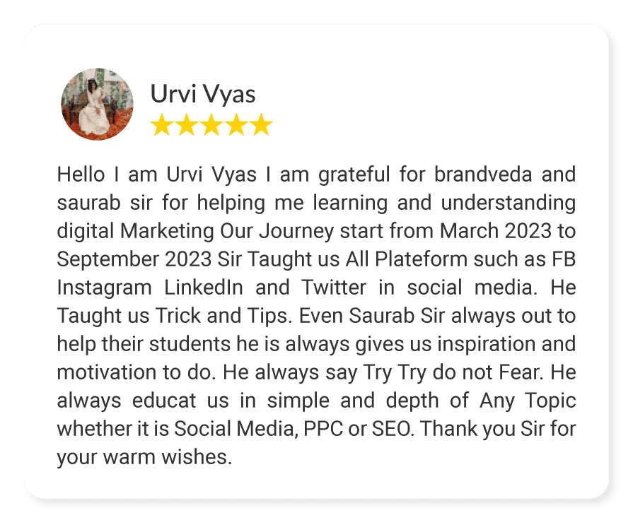 Learning digital marketing at Brandveda has opened up a new world of possibilities for my business. I can now optimize my content and rank higher on Google. Saurabh sir's strategic teaching style and experience have been instrumental in my growth as a digital marketer